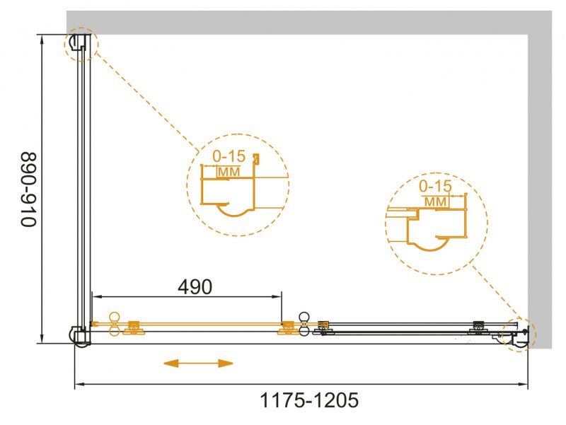 Монтаж: пристенный в угол; Возможная установка: на поддон, на пол; Высота: 1950 мм ; Форма: прямоугольная ; Ориентация: при заказе указывайте ориентацию; Конструкция двери: раздвижная; Исполнение полотна двери: прозрачное (C), прозрачное с матовым принтом (CP); Количество секций двери: 1; Толщина полотна двери: 6 мм; Цвет профиля: хром (Сr), бронза (Br), золото (G) ; Материал полотна двери: закаленное стекло, стандарт EN12150-1:2000; Материал профиля: анодированный алюминий, стандарт DIN17611 2007; Регулировка ширины: предусмотрена за счет боковых профилей; Крепления полотна двери: алюминиевая петля без подъемного механизма; Дополнительная информация: поддон приобретается отдельно; Ресурс эксплуатации: 15 лет; Гарантия: 3 года с даты продажи, за исключением резинотехнических изделий; - на резинотехнические изделия (силиконовые уплотнители, магнитные уплотнители) 1 год с даты продажи