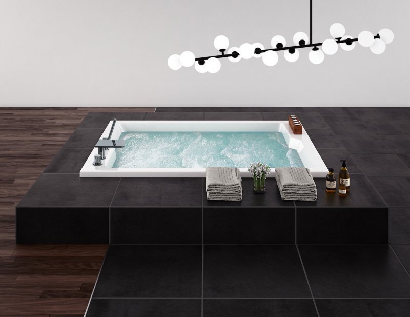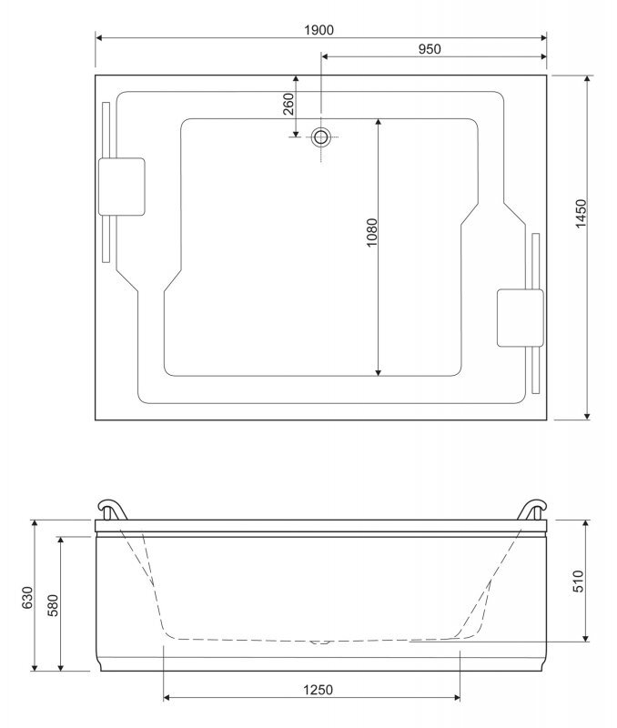 Монтаж: пристенный ; Форма: прямоугольная симметричная; Стилистика дизайна: современная; Размер мм, объем л: 1900x1450x510, 560 л; Материал: литьевой акрил; Цвет: белый; Слив-перелив: приобретается отдельно ; Расположение перелива: по центру; Дополнительная информация: возможна облицовка деревом или камнем; Гарантия: 10 лет с даты продажи;
