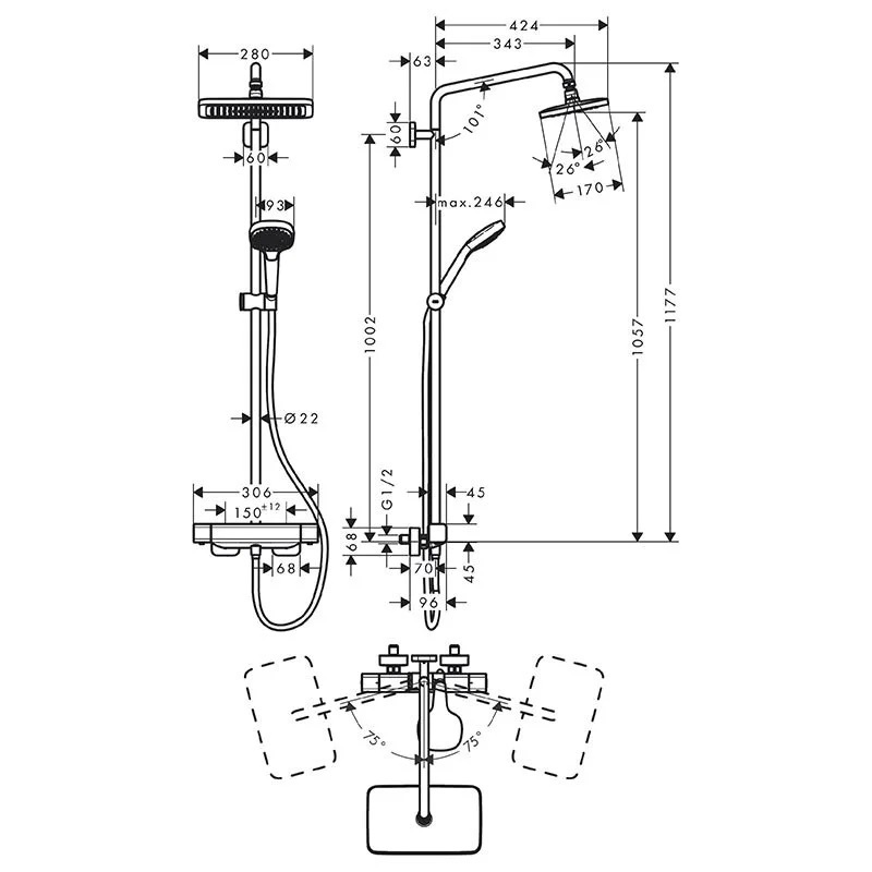 Hansgrohe Croma E Showerpipe 27660000, 280 1jet EcoSmart Душевая система с термостатом, хром