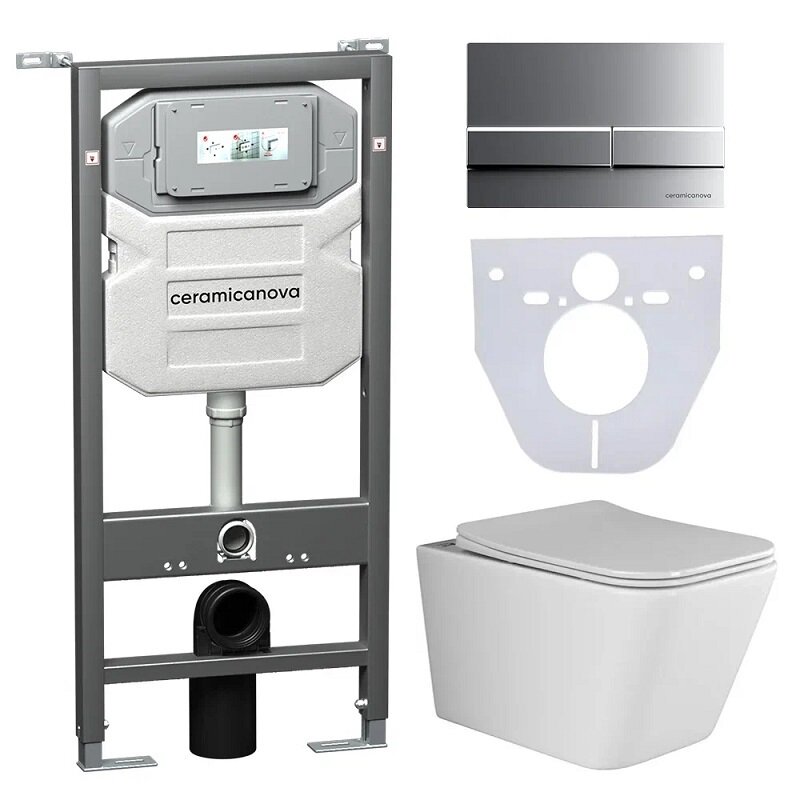 Комплект: Подвесной унитаз Metric Rimless арт. CN3007 + Шумоизоляционная панель для инсталляции арт. CN1000 + Система инсталляции для унитазов CERAMICANOVA Envision с кнопкой смыва Flat цвет хром матовый, креплениями, арт. CN1002M