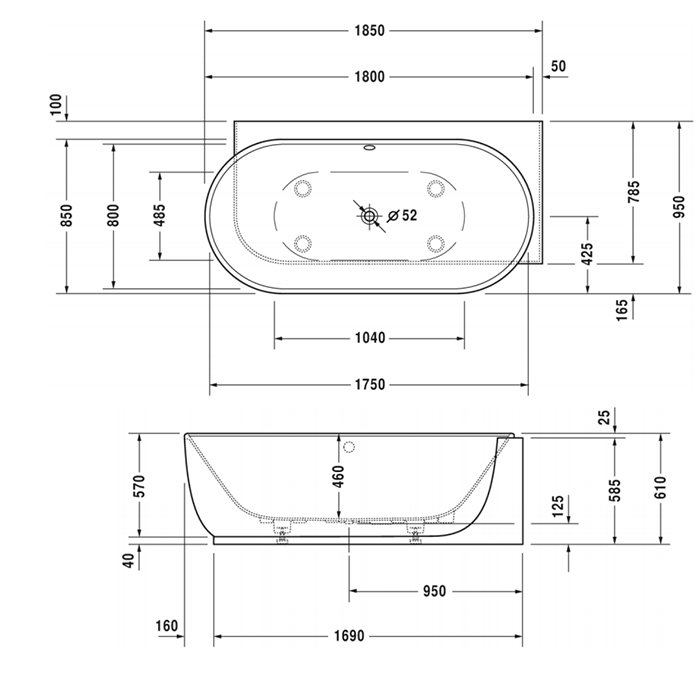 Duravit Luv Ванна из минерального литья 1850x950мм, гидромассажная угол справа, с бесшовной панелью и ножками, со слив переливом, цвет белый 760432000AS0000