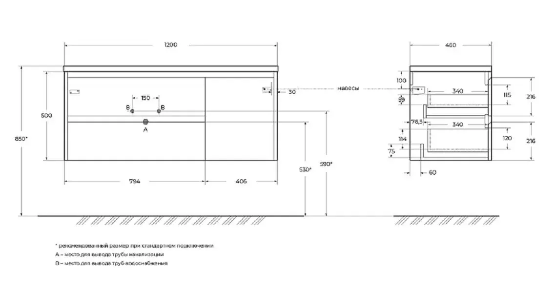 • Габариты корпуса тумбы (ШхВхГ): 1200х500х460 мм.