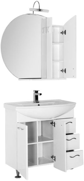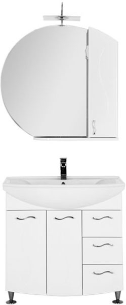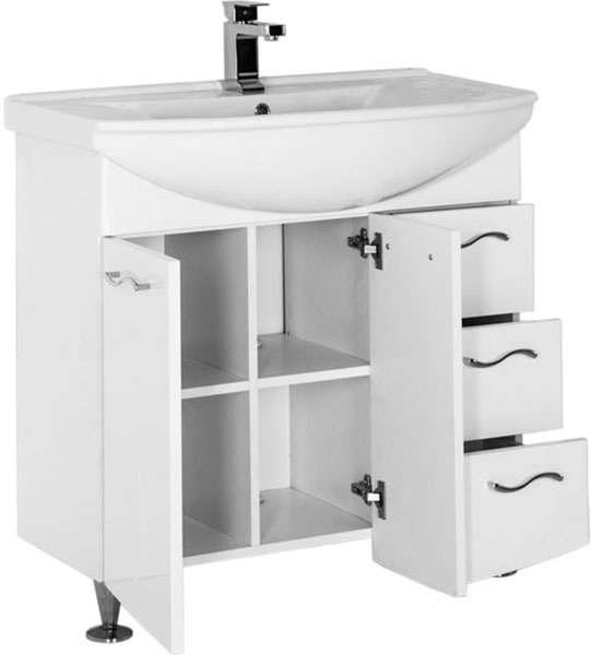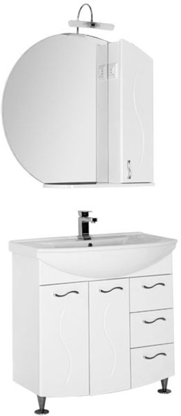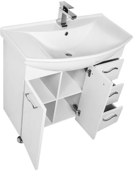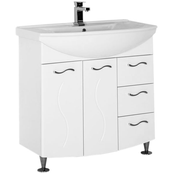 Тумба под раковину Aquanet Моника 85 186771 с выдвижными ящиками и распашными дверцами. Элегантный стиль с мягкими волнообразными формами, функциональность и качество характеризуют коллекцию Моника. Тумба предназначена для использования в ванных комнатах с повышенной влажностью. Соответствует стандартам безопасности. Благодаря механизму доводчиков ящики и дверцы закрываются бесшумно и легко.