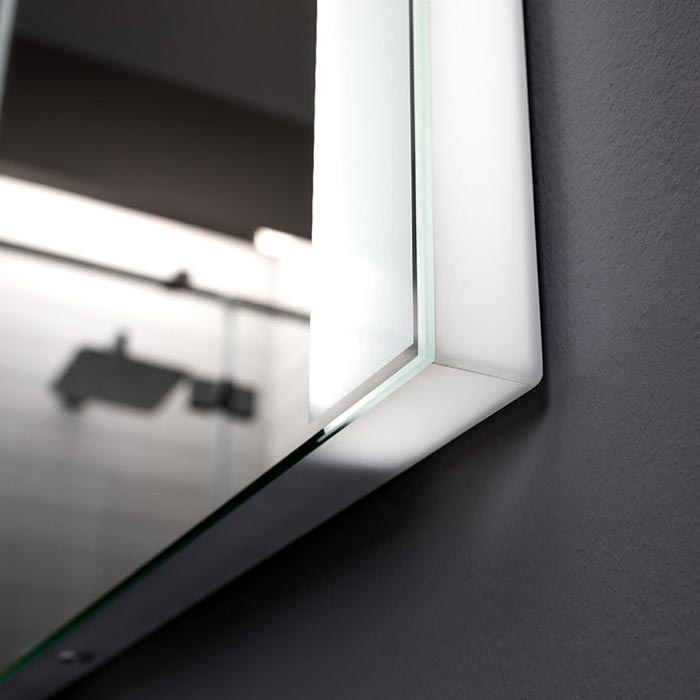 Световые блоки расположены с двух сторон от зеркального полотна. Свет проходит изнутри через боковые стороны зеркала и участки, не имеющие амальгамового покрытия, придавая конструкции легкость и воздушность. Свет неяркий, приглушенный.