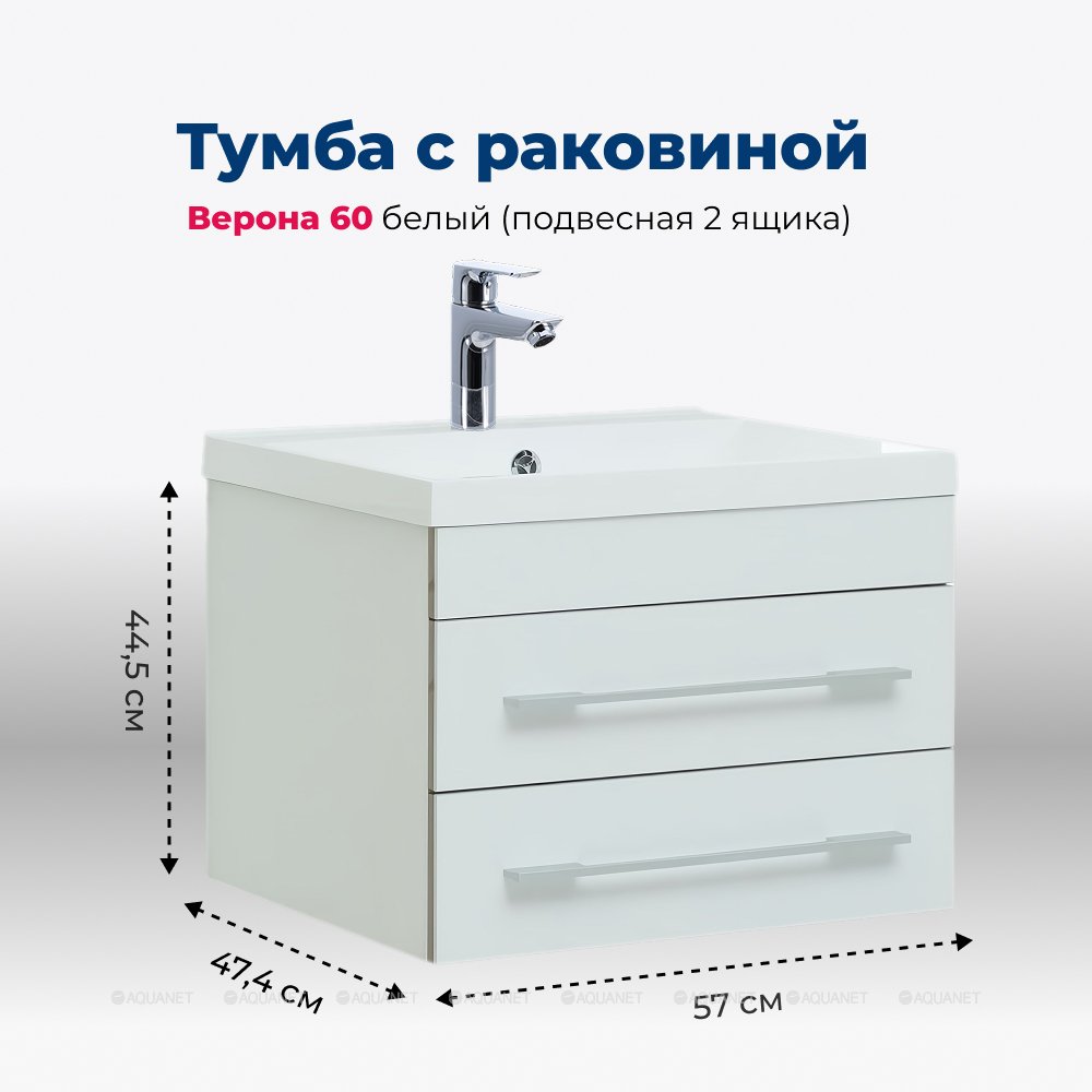 Aquanet 287669 Тумба с раковиной Верона 58 белый (подвесная 2 ящика, раковина Aquanet) (287669)