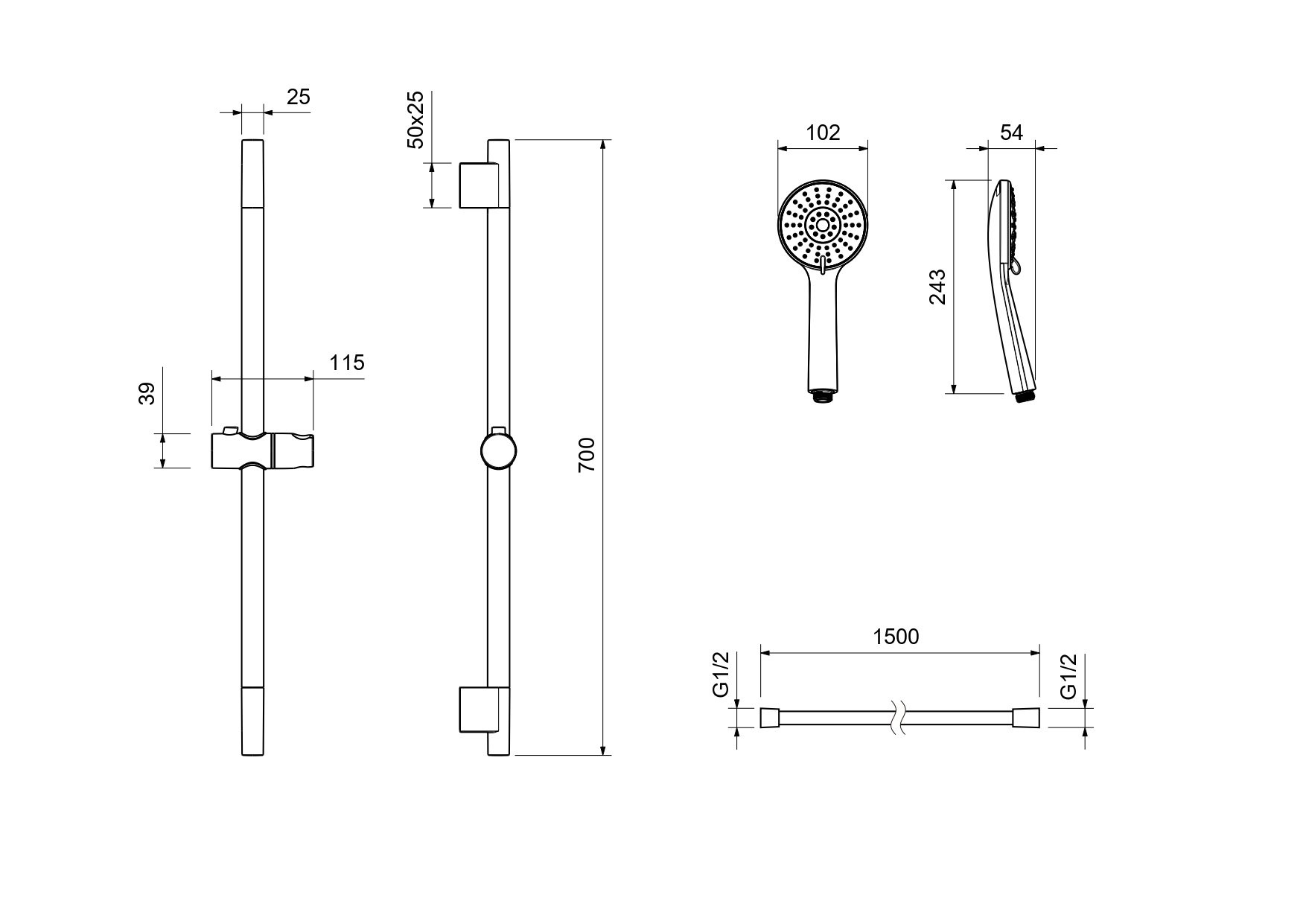 В комплекте: душевая штанга; держатель душевой лейки; душевая лейка; душевой шланг; монтажный комплект