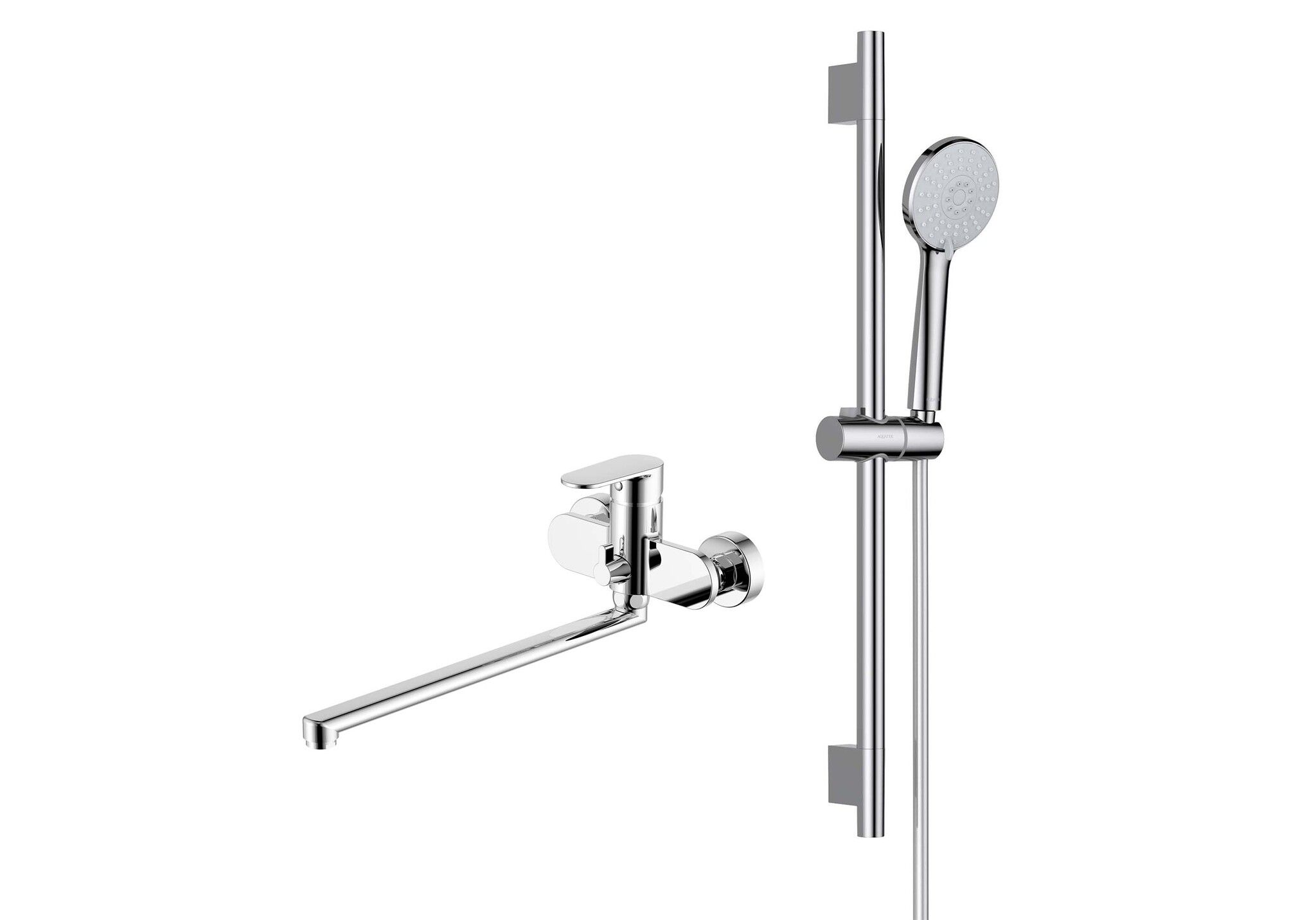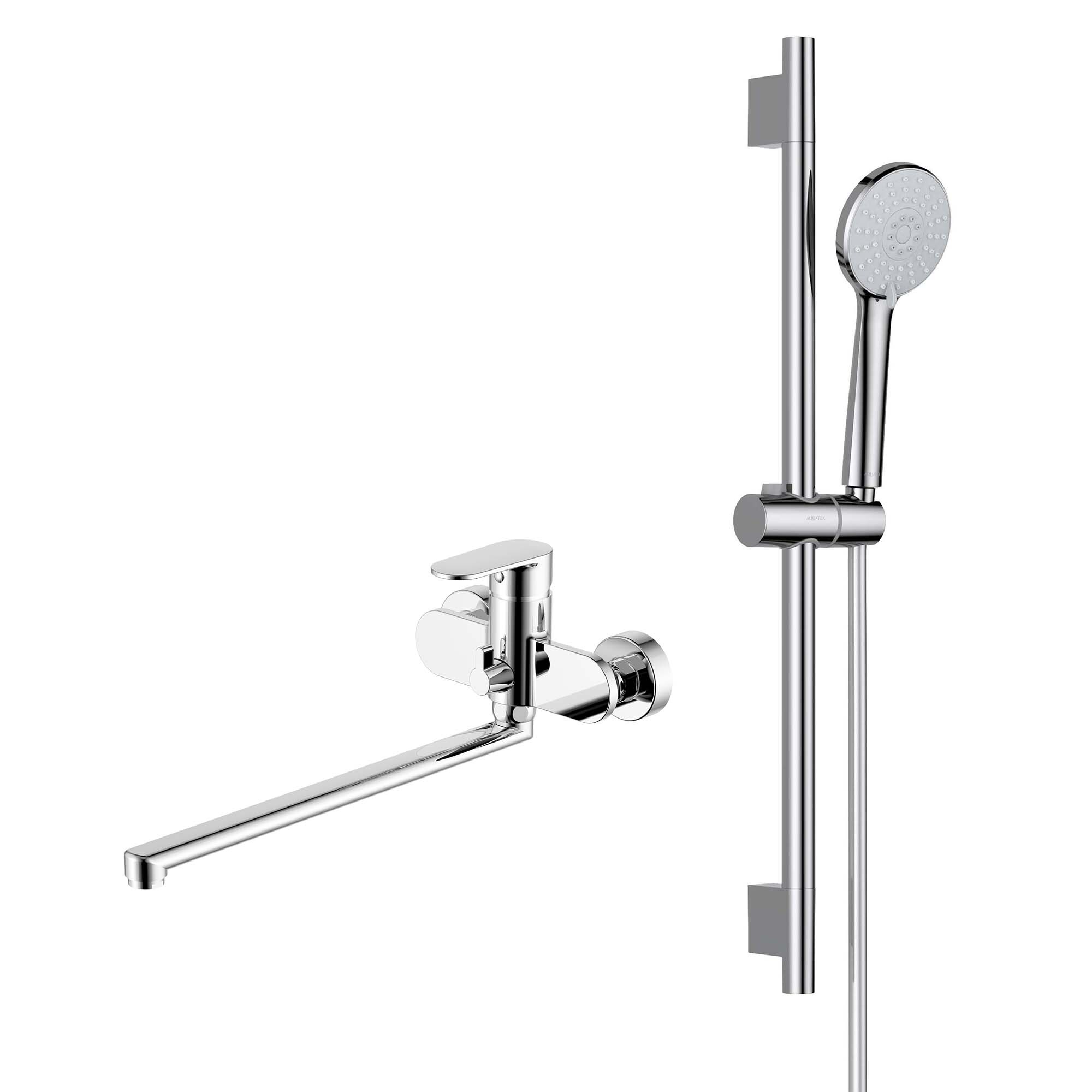 В комплекте: душевая штанга; держатель душевой лейки; душевая лейка; душевой шланг из ПВХ; мыльница; монтажный комплект