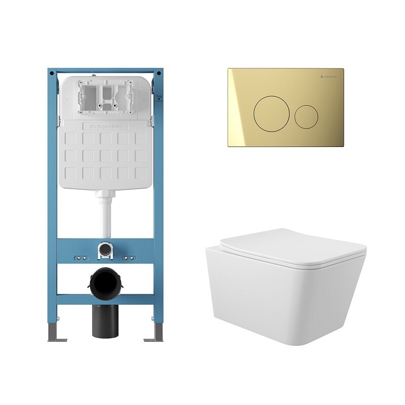 Aqueduto AQDS234 AQD комплект: TECNICA Novo Система инсталляции для подвесного унитаза, CIRCULO Novo Панель смыва, шлифованное золото, MACIO Унитаз подвесной 520*370 безободковый, сиденье с микролифтом, белый глянцевый
