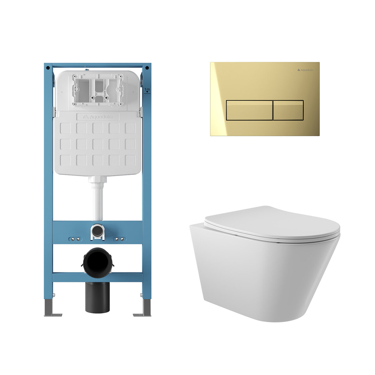 Aqueduto AQDS251 AQD комплект: TECNICA Novo Система инсталляции для подвесного унитаза, RETANGULO Novo Панель смыва, шлифованное золото, CONE Унитаз подвесной 525*360 безободковый, сиденье с микролифтом, белый глянцевый