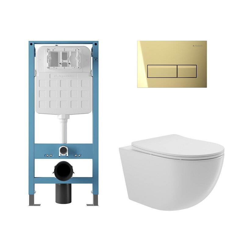 Aqueduto AQDS330T AQD комплект: TECNICA Novo Система инсталляции для подвесного унитаза, RETANGULO Novo Панель смыва, шлифованное золото, OVO Tornado Унитаз подвесной 525*360 безободковый, Tornado, сиденье с микролифтом, белый глянцевый