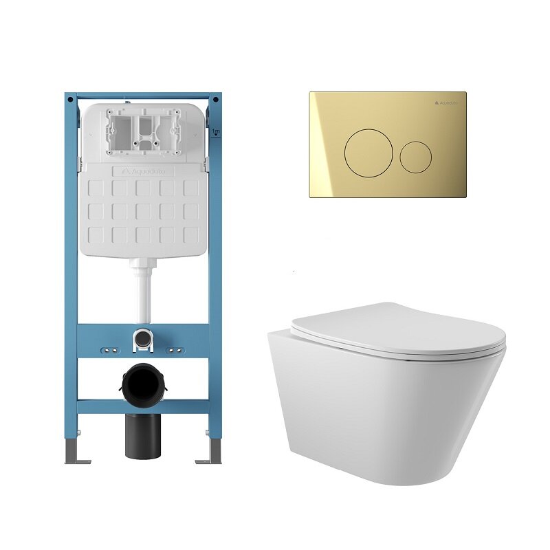 Aqueduto AQDS344T AQD комплект: TECNICA Novo Система инсталляции для подвесного унитаза, CIRCULO Novo Панель смыва, шлифованное золото, CONE Tornado Унитаз подвесной 525*360 безободковый, Tornado, сиденье с микролифтом, белый глянцевый