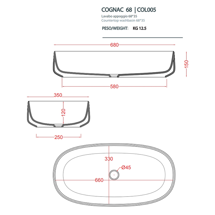 ArtCeram COL005 17 34 ArtCeram COGNAC Раковина настольная 68x35 см, цвет матовый черный, Saniglaze
