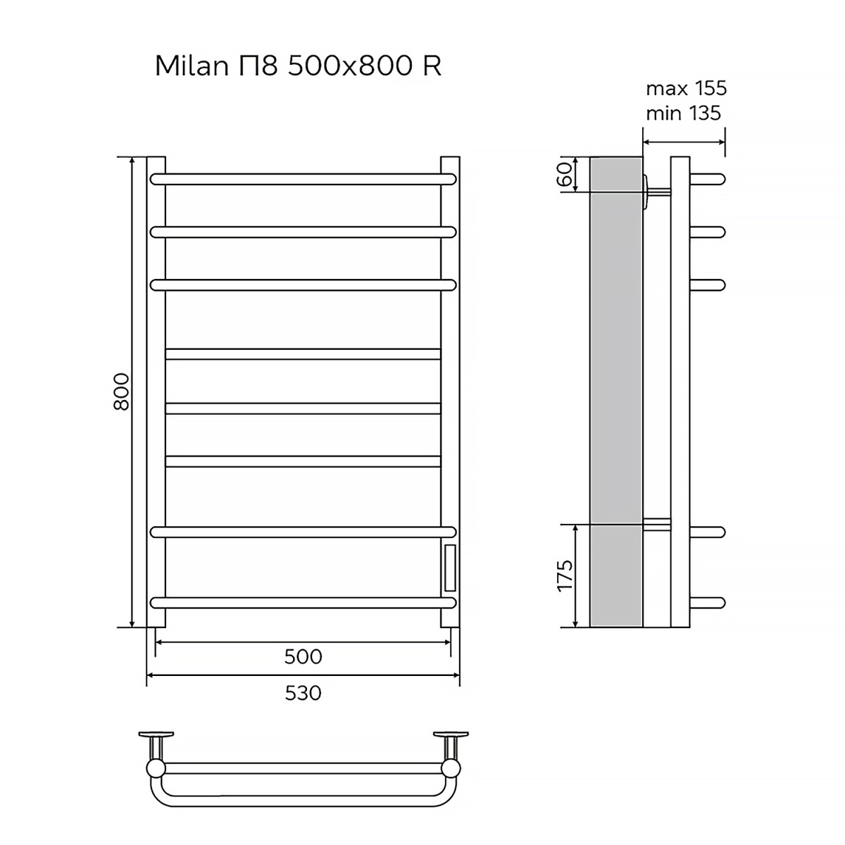 AZARIO MILAN AZ90858 Полотенцесушитель электрический 500/800 8 секций, диммер справа, хром