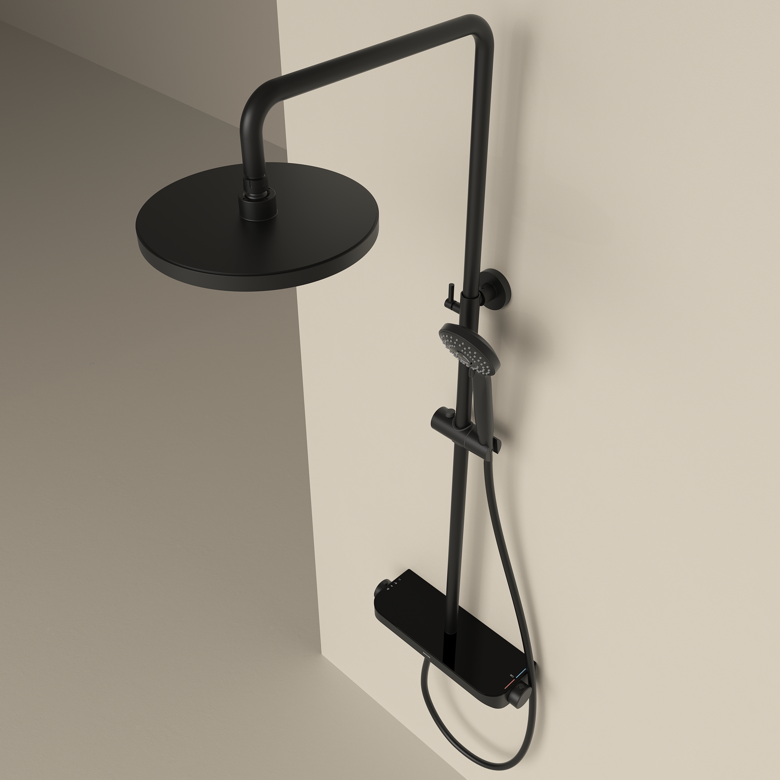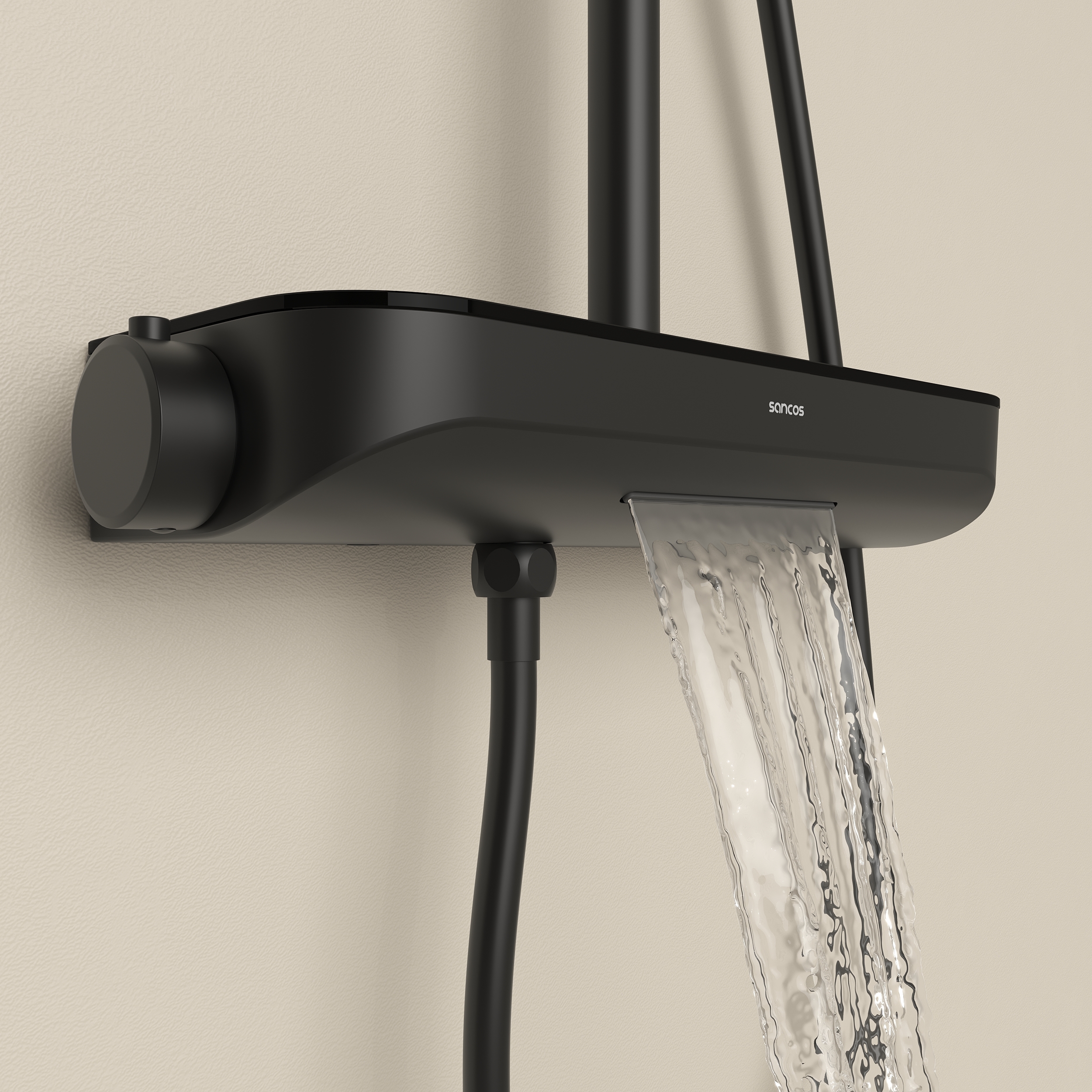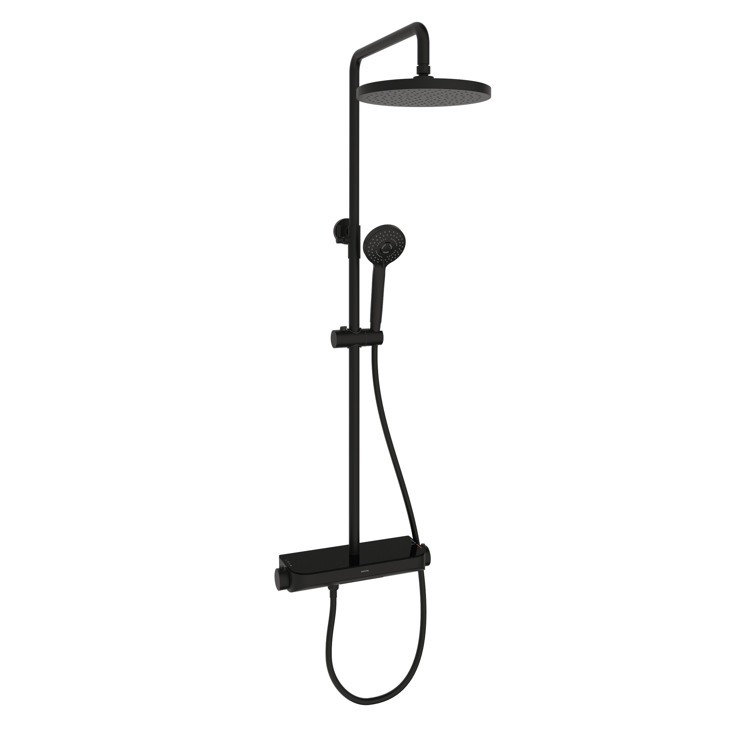 Sancos Teo SC11002MB Душевая стойка c термостатом, изливом и полкой, цвет: черный матовый