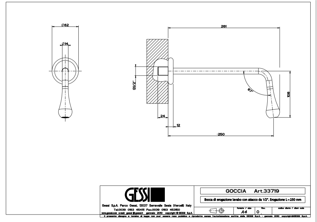 Gessi Goccia 33719#713 Настенный излив 250мм, для монтажа с удаленным управлением 33700/33743 (не входит в комплект), цвет: Antique Brass