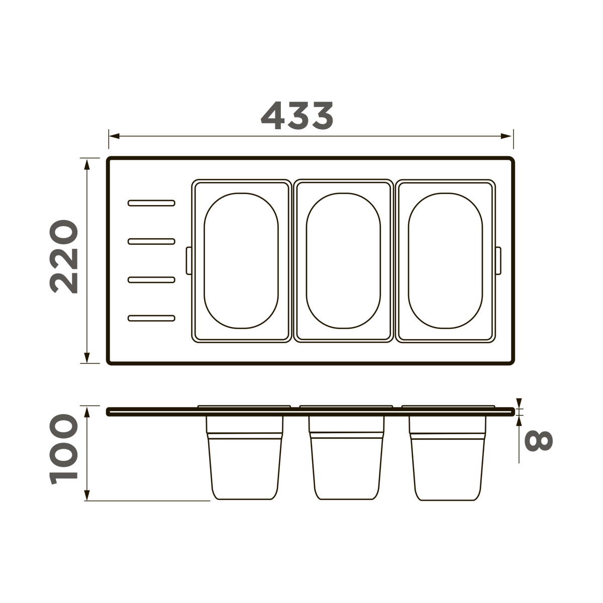 Контейнеры коллекции DC представляют собой различные конфигурации, состоящие из нескольких элементов: одной, двух или трех чаш, изготовленных из нержавеющей стали и фиксирующей подставки, изготовленной из высокопрочного HPL пластика. Чаши свободно вынимаются из пластиковой подставки и перемещаются, а конструкция подставки разработана таким образом, чтобы ее можно было удобно разместить на внутренних ступенчатых направляющих моек, коллекций SINTESI и KITAGAWA.