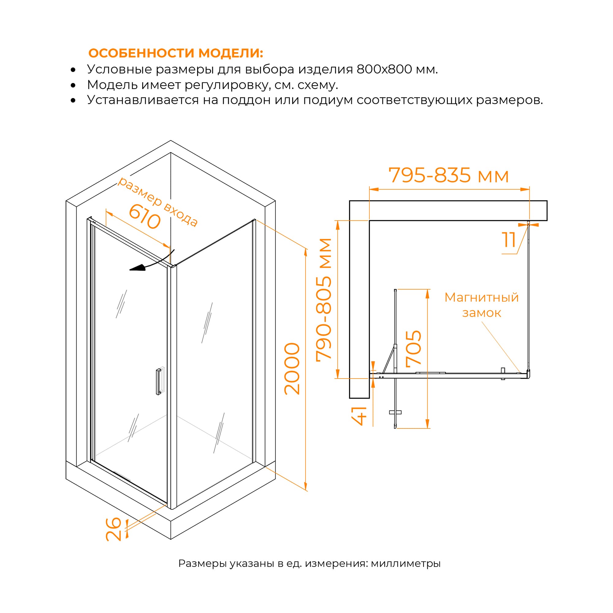 RGW 7032135288-11 Душевой уголок 80*80*200 RGW SV-135-2 (SV-05-2 + Z-050-3) Квадрат/Хром/Прозрачное/8 мм