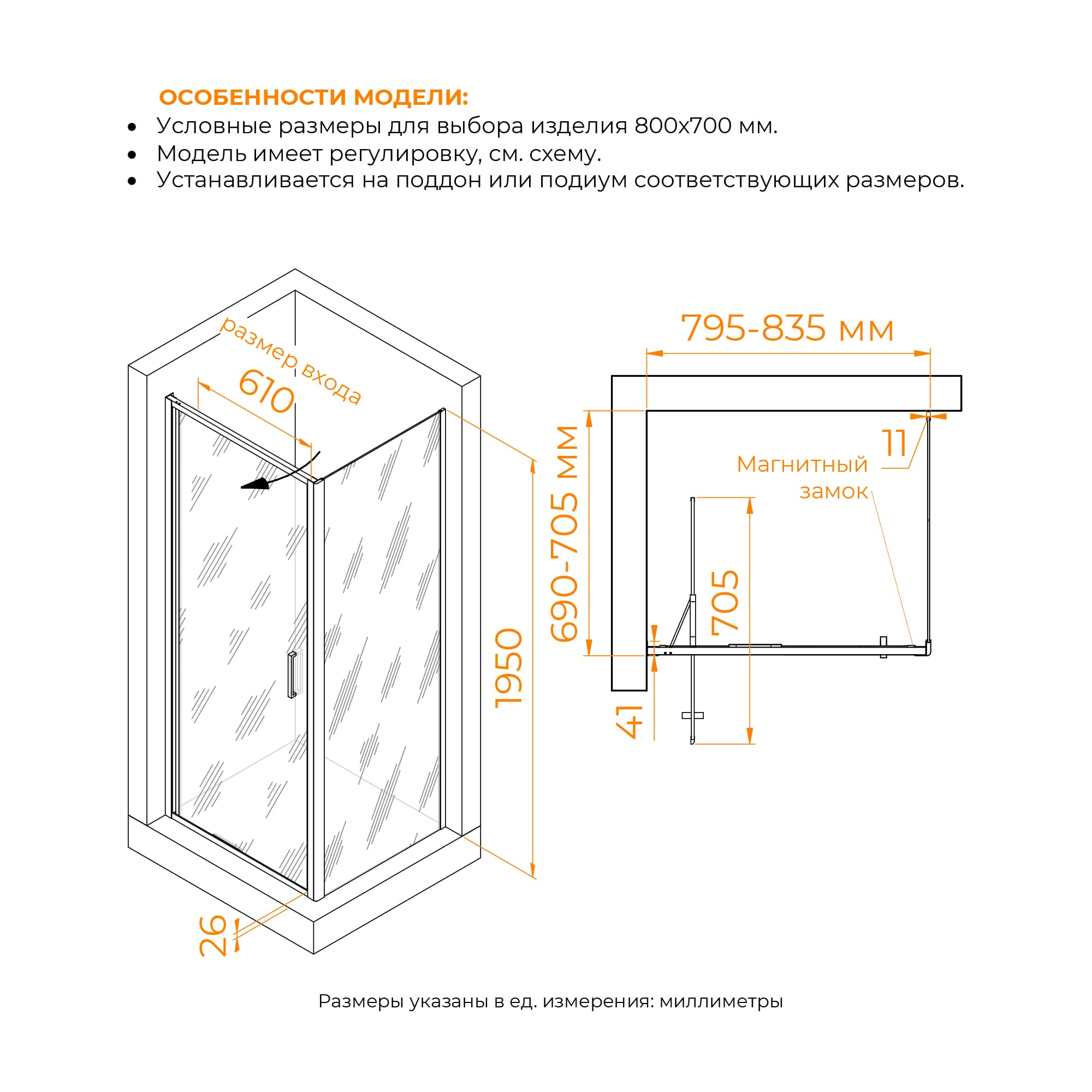 RGW 7032145287-14 Душевой уголок 80*70*200 RGW SV-145-2B (SV-05-2B + Z-050-3B) Прямоуг./Чёрный/Прозрачное/8 мм (Easy)