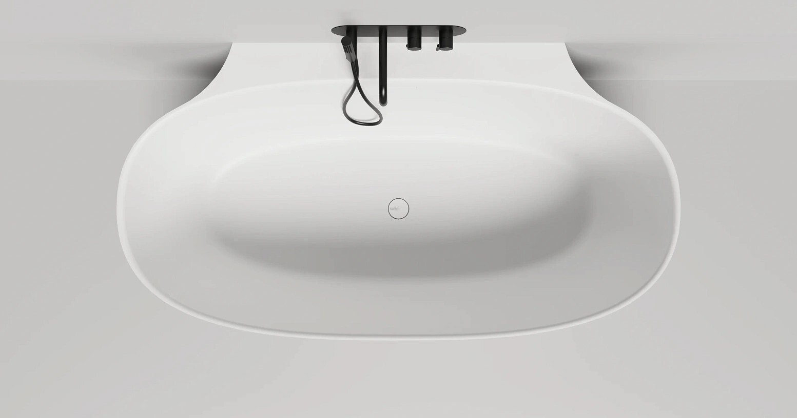 Эта модель соединяет в себе классическую овальную форму изголовий и спрятанный за ними пристенный борт. Благодаря такой конструкции создаётся впечатление отдельностоящей ванны, но сохраняется практичность плотного примыкания к стене и дополнительной поверхности для хранения косметических средств и аксессуаров. При желании здесь также можно разместить и смеситель. Более тонкая, детальная проработка формы чаши позволила уйти от классического понимания пристенной ванны с массивной боковой проекцией: блок, соприкасающийся со стеной, будто утоплен вдоль задней поверхности. Такова новая эстетика облегчённого дизайнерского решения Salini.