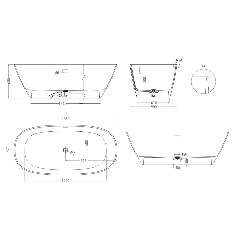 Salini 102519GF SOFIA 185x90 Ванна, донный клапан "Click-Clack" цвет на выбор, сифон, интегрированный слив-перелив, покраска по RAL полностью