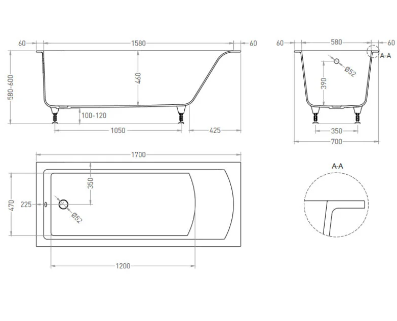 Salini 104423MF CASCATA 170x70 Встраиваемая ванна с прямоугольной чашей, регулируемые ножки, RAL полностью