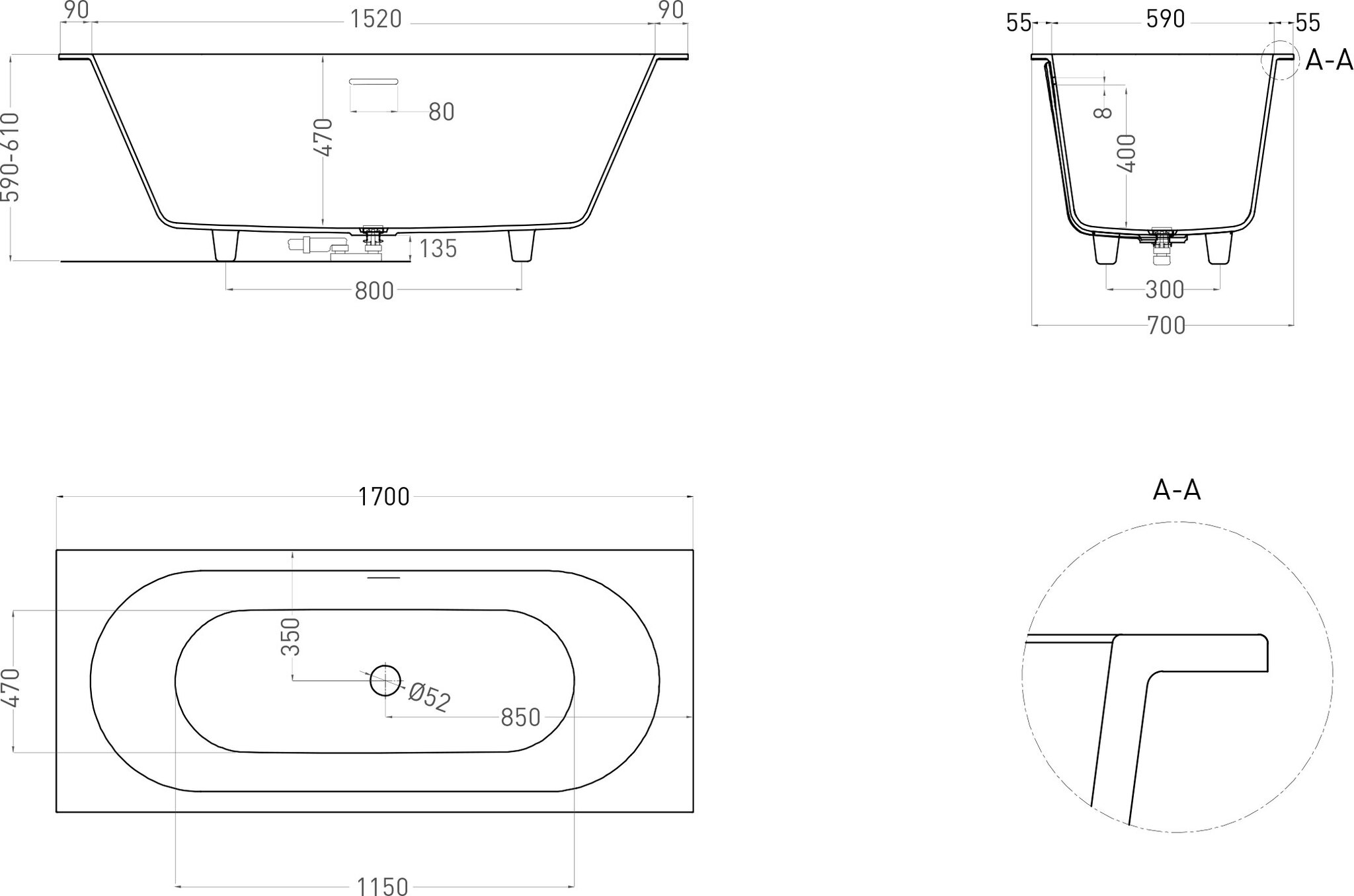 • Комплектация:ванна, регулируемые ножки до 2 см, интегрированный слив перелив, донный клапан
